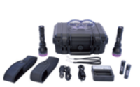 1 pereche ochelari de protecție UV, 1 PSU de încărcare, 1 stație de încărcare a bateriei, 1 încărcător auto, 8 baterii în interior și 2 suplimentare, 1 geantă de transport pentru toate cele patru lămpi și 1 kit filtru cameră criminalistică